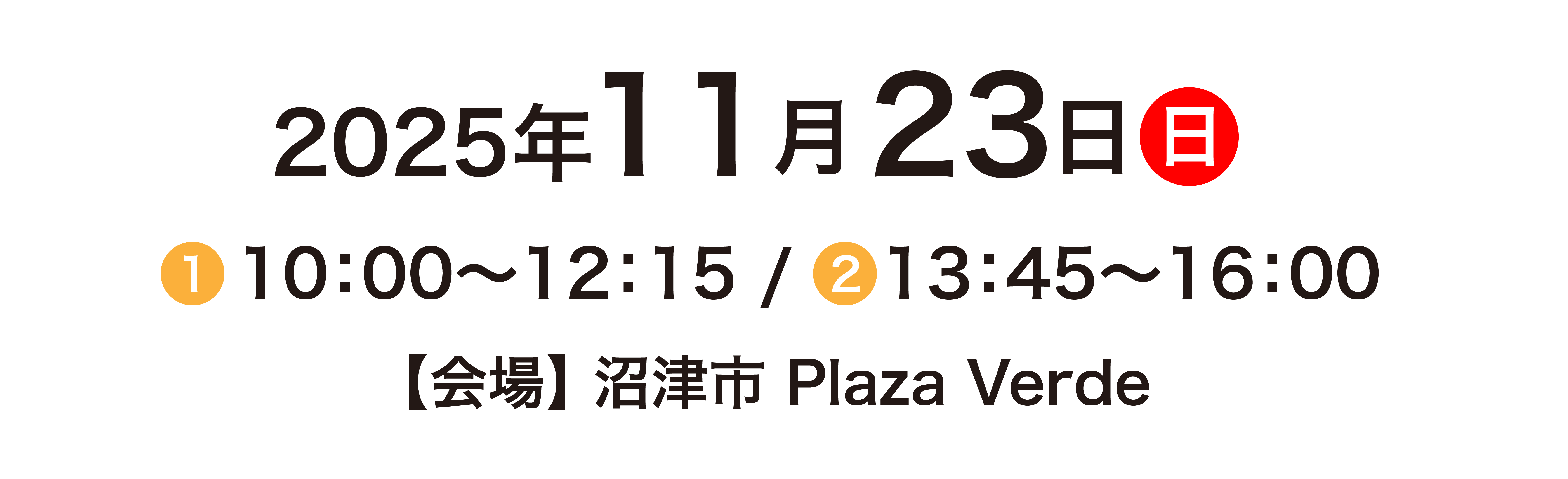 | [日時] | 11月23日(日) ①10:00~12:15 ②13:45~16:00 中止 ※開始時間の15分前より受付開始します。 ※お子さまの進行により15〜30分終了時間が延びる場合があります。 |